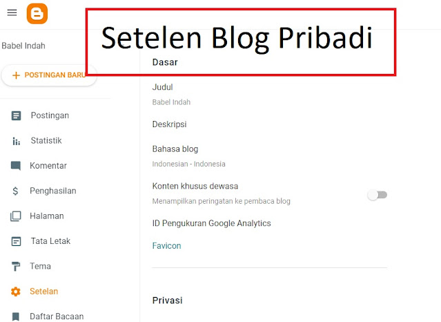 Nah, mari kita pahai lagi bagian-bagian atau item dalam menu setting atau Setelan di dashboard blog (blogspot) kita. Yakni sebagai barikut.